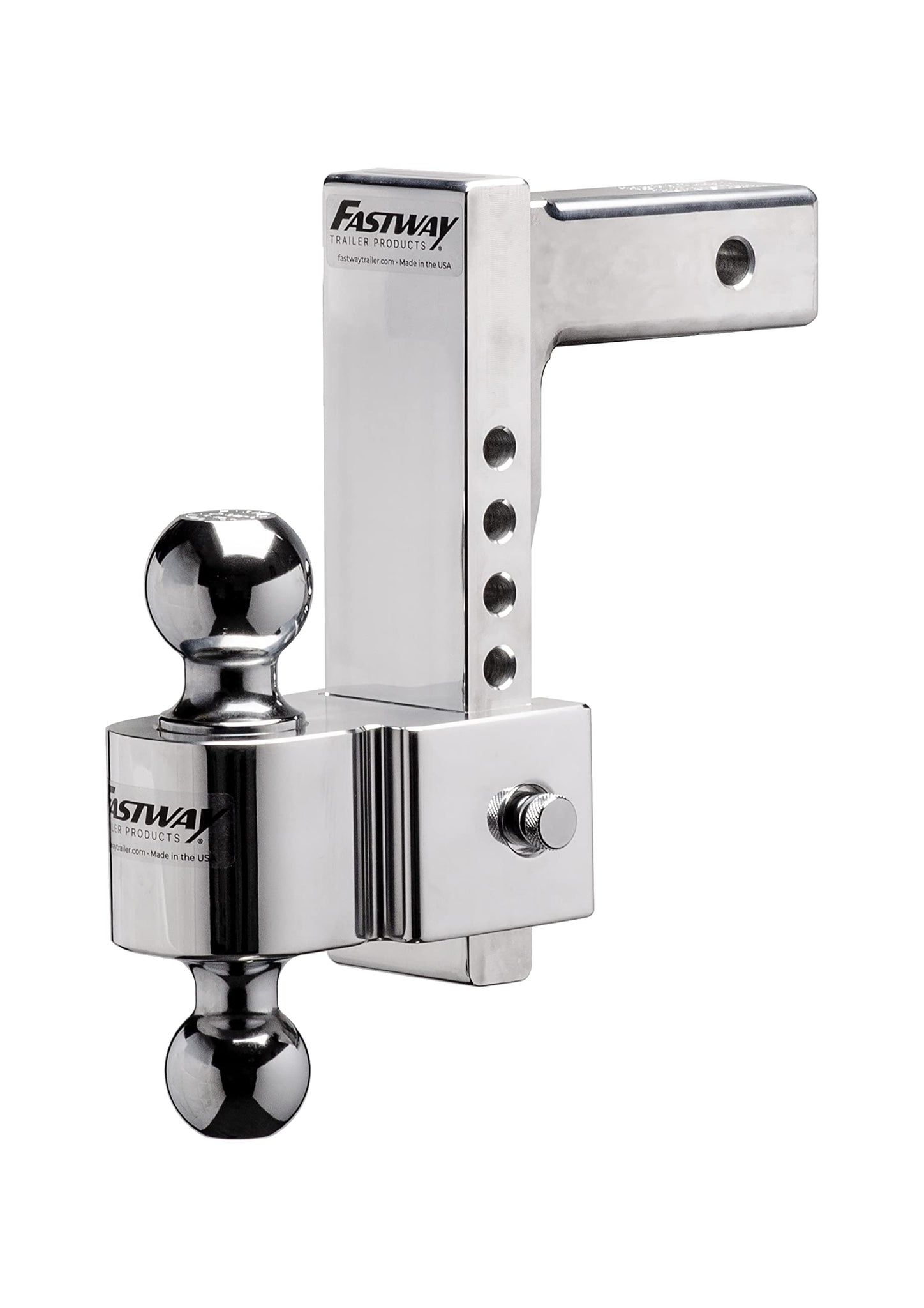 The Fastway Flash Simple is the best looking pin-style, ball mount you can buy. From stunning good looks to fast and easy adjustments, you'll be amazed every time you use it. The lightning-quick adjustments will save you time and effort. Each Flash ball mount is precision machined in the Mountain West, making it stronger and longer lasting than the competition. The Fastway Flash Simple is a great choice for towing multiple trailers. With adjustable heights and dual hitch balls, switching trailers is a snap. Its gorgeous design will make your truck look fantastic, and because it is made from aircraft-grade aluminum, it will last for years. The Flash 8" Simple (42-00-2800) features: 8" drop, 9" rise. 2" & 2-5/16" hitch balls. Fits 2" receiver hitch. Fast and easy adjustments, saving you time and effort. Polished aluminum, making your truck look its best. Precision machined for strength and durability. Aircraft-grade aluminum for corrosion resistance and outstanding performance. Super strength alloy, for years of safe towing. 1,000 lb. max tongue wt. / 10,000 lb. max trailer wt. Limited One Year Warranty. Fastway Flash-Faster, Easier.