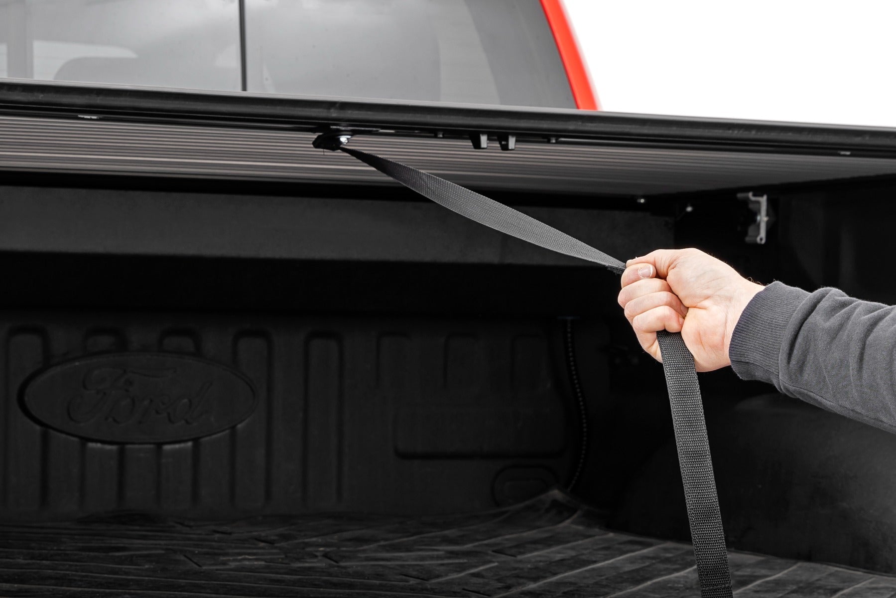 Superior Protection and Functionality. Protect your bed from weather and add security with Rough Country's sleek Retractable Bed Covers. Boasting a weather-resistant vinyl covering and a rigid aluminum panel design Rough Country's Retractable Covers sit firmly on the bed rails allowing for full rear visibility. These durable, powder-coated heavy-gauge aluminum bed covers feature a flush, low-profile design that gives your truck a clean, sleek look while protecting the contents of your bed. Innovative Design. Each cover features a premium, matte black finish for uncompromised protection and killer good looks. The convenient retractable design allows easy access to your bed and the ability to haul large items without entirely removing the cover. Simply utilize the pull strap to retract the cover to gain access to your bed! This cover features a full-width handle that allows you to open or close the cover from either side of the bed. Each cover offers a tension spring that helps the cover retract smoothly and easily in seconds! Installation. With a 100% bolt-on installation process, installation couldn't be easier. With an estimated timeframe of 30 minutes this cover can be installed at home using standard tools and can be completed efficiently and quickly! Limited Lifetime Replacement Warranty. Rough Country's Retractable Bed Covers is backed with a limited lifetime replacement warranty towards manufacturer defects. As such, the product is protected from structural and workmanship damage after the date of purchase. With our industry-leading warranty give yourself peace of mind when using Rough Country's Suspension products!