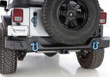 The heavy duty rear bumper includes 2" receiver tow hitch made of 1/4" steel reinforced with 7/16" ring. The steel welded accessory panel allows for mounting a hi-lift jack or gas can. You can mount the tire in standard or slanted position, alleviating weight from the tailgate. A 3rd brake light bracket is included but the light kit is sold separately. Modular tire carrier, part number 9950919, is sold separately.