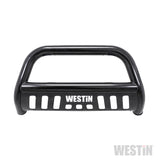 Westins E-Series Bull Bar is a front-end light bar designed for trucks and larger model SUVs. It mounts to the vehicles existing mounting points with no drilling required and comes complete with vehicle specific mount kit. It also features mounting points for 2 auxiliary lights up to 6 inches in diameter. The E-Series Bull Bar features a laser cut Westin block letter logo design on the skid plate. Available in black powder coated e-coated steel with a textured black skid plate backed by a 3 year warranty. Optional license plate bracket is available.