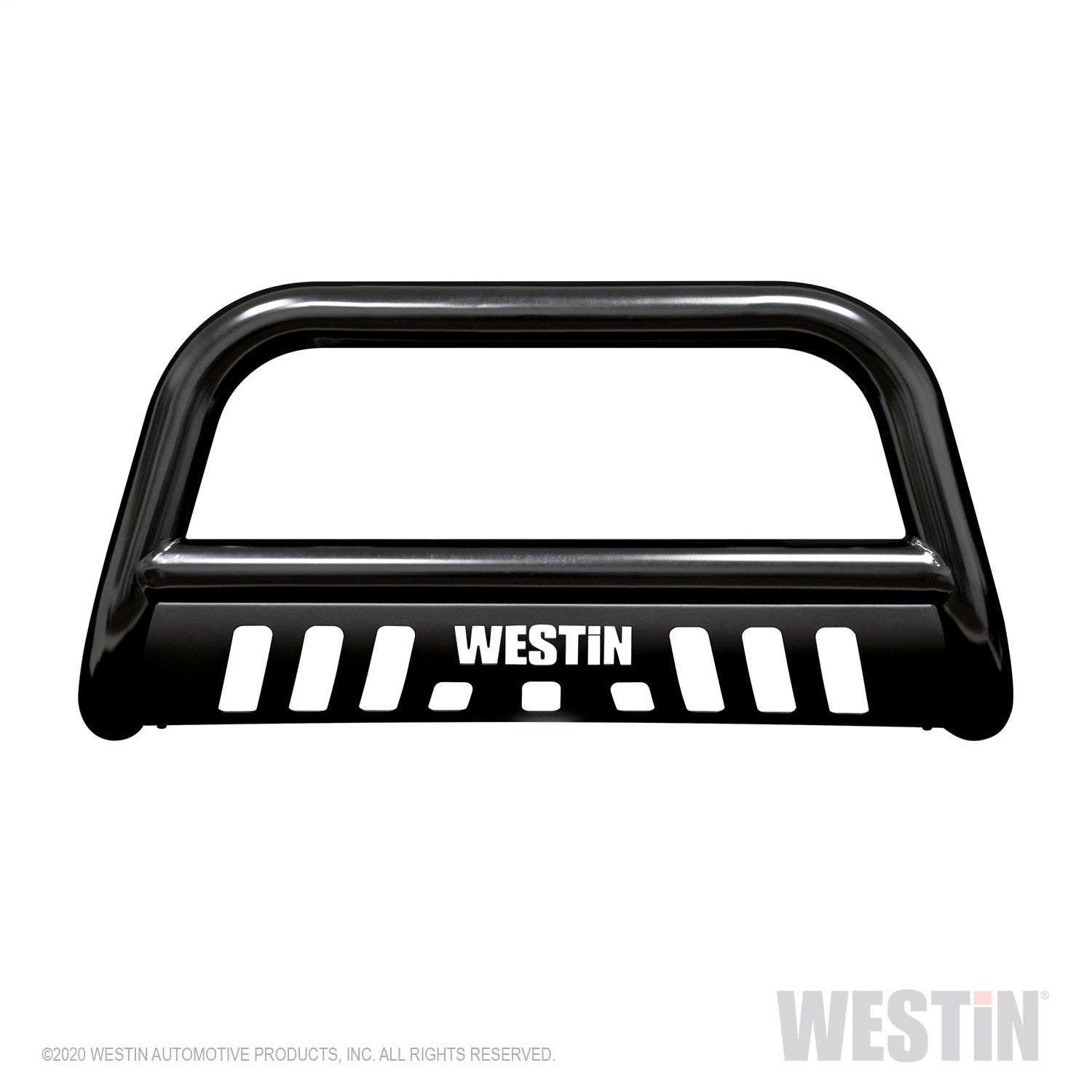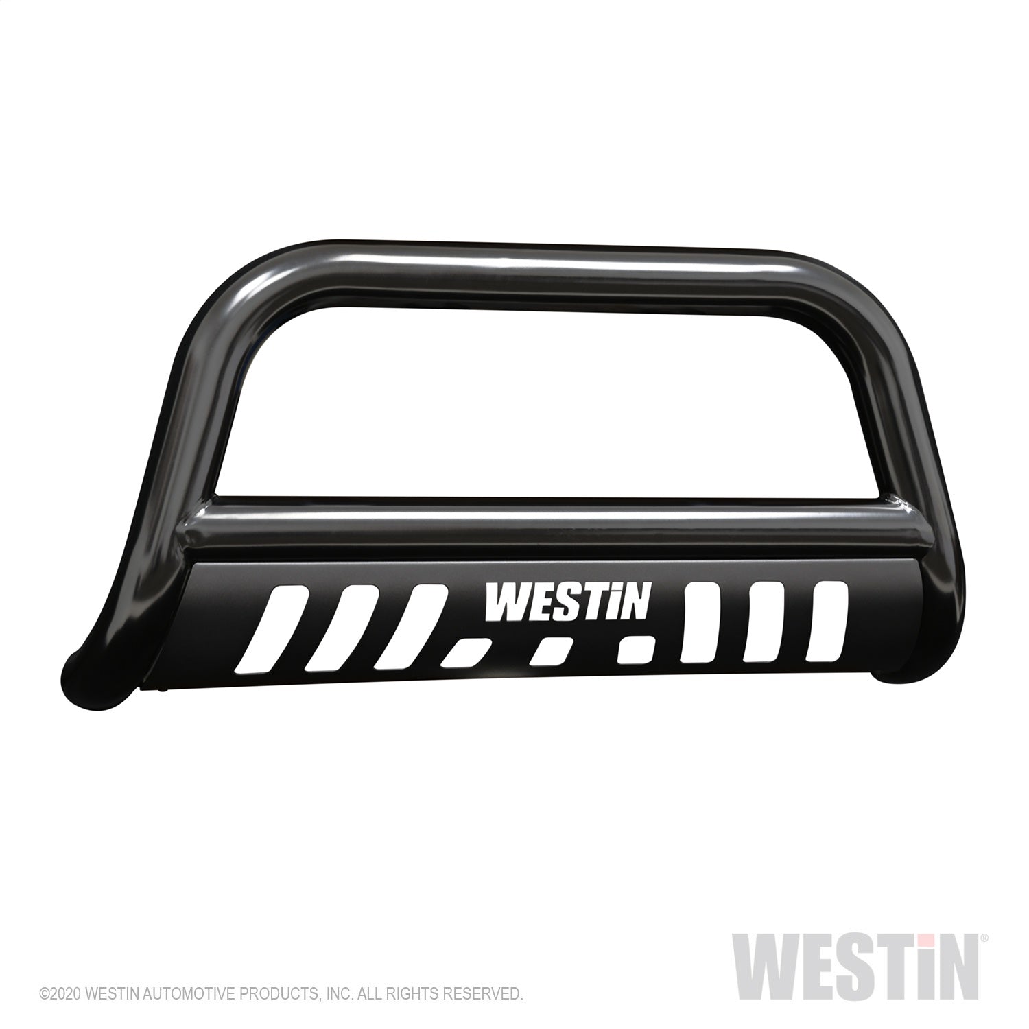 Westins E-Series Bull Bar is a front-end light bar designed for trucks and larger model SUVs. It mounts to the vehicles existing mounting points with no drilling required and comes complete with vehicle specific mount kit. It also features mounting points for 2 auxiliary lights up to 6 inches in diameter. The E-Series Bull Bar features a laser cut Westin block letter logo design on the skid plate. Available in black powder coated e-coated steel with a textured black skid plate backed by a 3 year warranty. Optional license plate bracket is available.