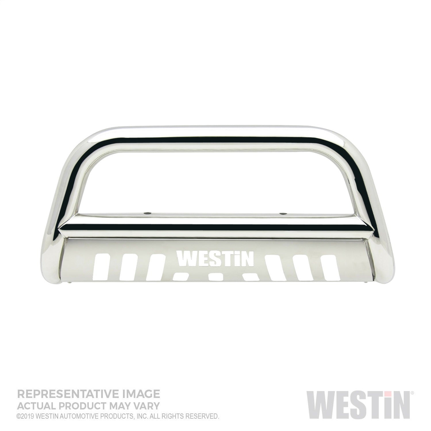 Westin(TM) E-Series Bull Bars are a front-end light bar designed for trucks and larger model SUVs. It is made of 3 diameter polished stainless steel tube. It mounts utilizing existing vehicle mounting points and installation does not require any drilling to the vehicle frame. Comes complete with mounting kit the Westin(TM) E-Series Bull Bar provides a mounting point for 2 auxiliary lights up to 6 in diameter. It features a die-cut Westin(TM) block logo design on the stainless steel skid plate unique to the Westin(TM) E-Series Bull Bar.