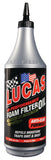 Lucas Foam Filter Oil is a unique low solvent, medium viscosity formula designed to penetrate the filter media and trap dust, dirt and sand while improving air flow. Because it has a slight tackiness it stays in place throughout the service life. Its water proof formula helps block out moisture and water. Will not clog foam filters even in colder temperature applications. Its blue color ensures coverage across the entire filter area. We recommend using an over the counter cleaning agent to remove oil prior to reuse. Lucas Oil is presently working on introducing its own foam filter cleaning agent.