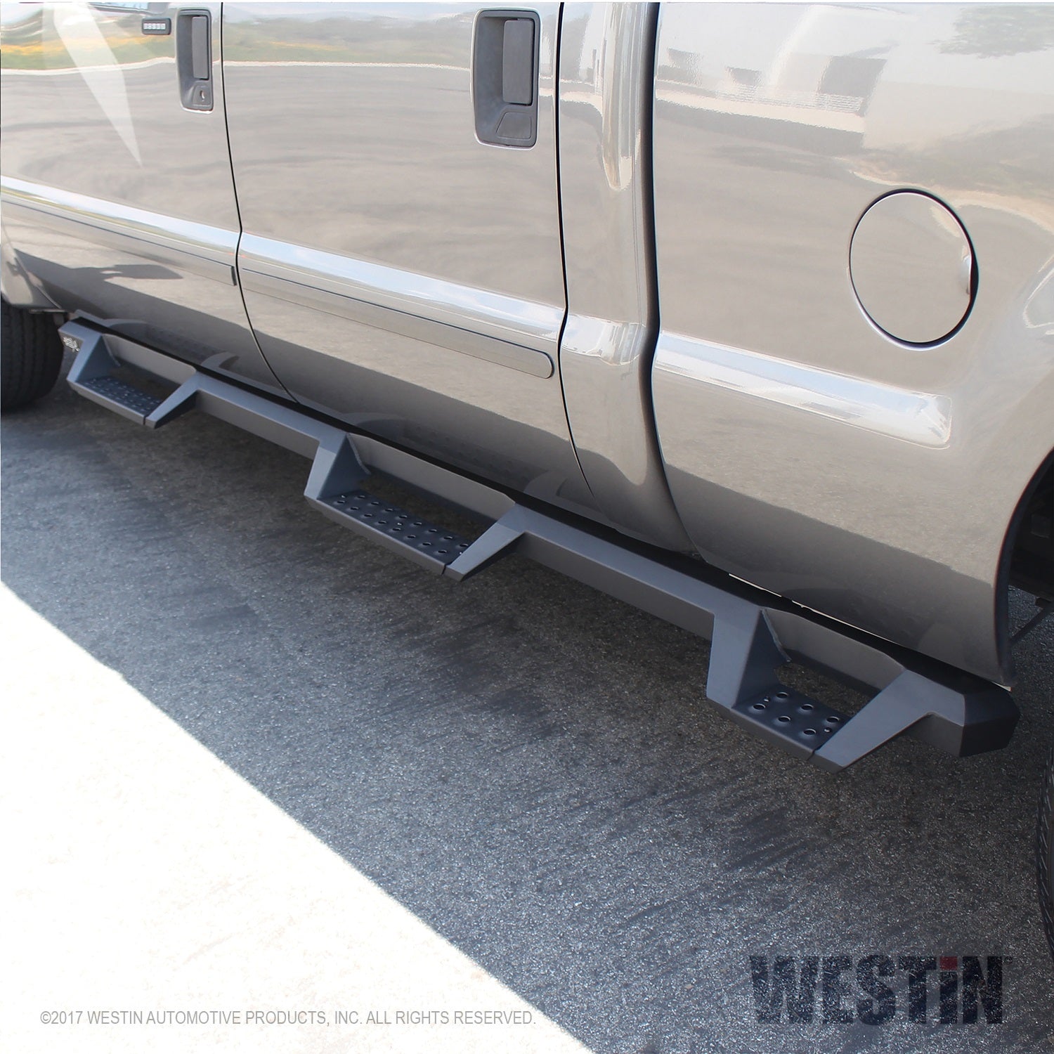 Westins HDX Drop Wheel-to-Wheel Nerf Step Bars feature a notched bar design with a 3rd step location for easy bed access. They provide strong traction with over 2 inches more of toe/heel step area than our Westin's HDX Drop W2W Nerf Step Bars include an added 3rd step location for easier bed area and cargo access. HDX also boasts more than 2 inches of added toe/heel step area which far exceeds all other competitive brands. HDX's notched bar design construction results in a reliable long lasting Bar, with a solid fit and a rugged look. The added length of HDX Drop Wheel-to-wheel Nerf Step Bars provides users with better cab access and better footing and traction for both drivers and passengers. Product includes mount kit and is offered in a variety of vehicle specific applications. Bolt-on installation so no drilling required. Mount kit included. Westin's exclusive Isolator Bracket supports the step bar past the truck cab, a feature that competitors do not offer. Without an Isolator Bracket, the step area that extends past the vehicle is left unsupported. Our unique design provides extra bed support without resulting in annoying creaking sounds.