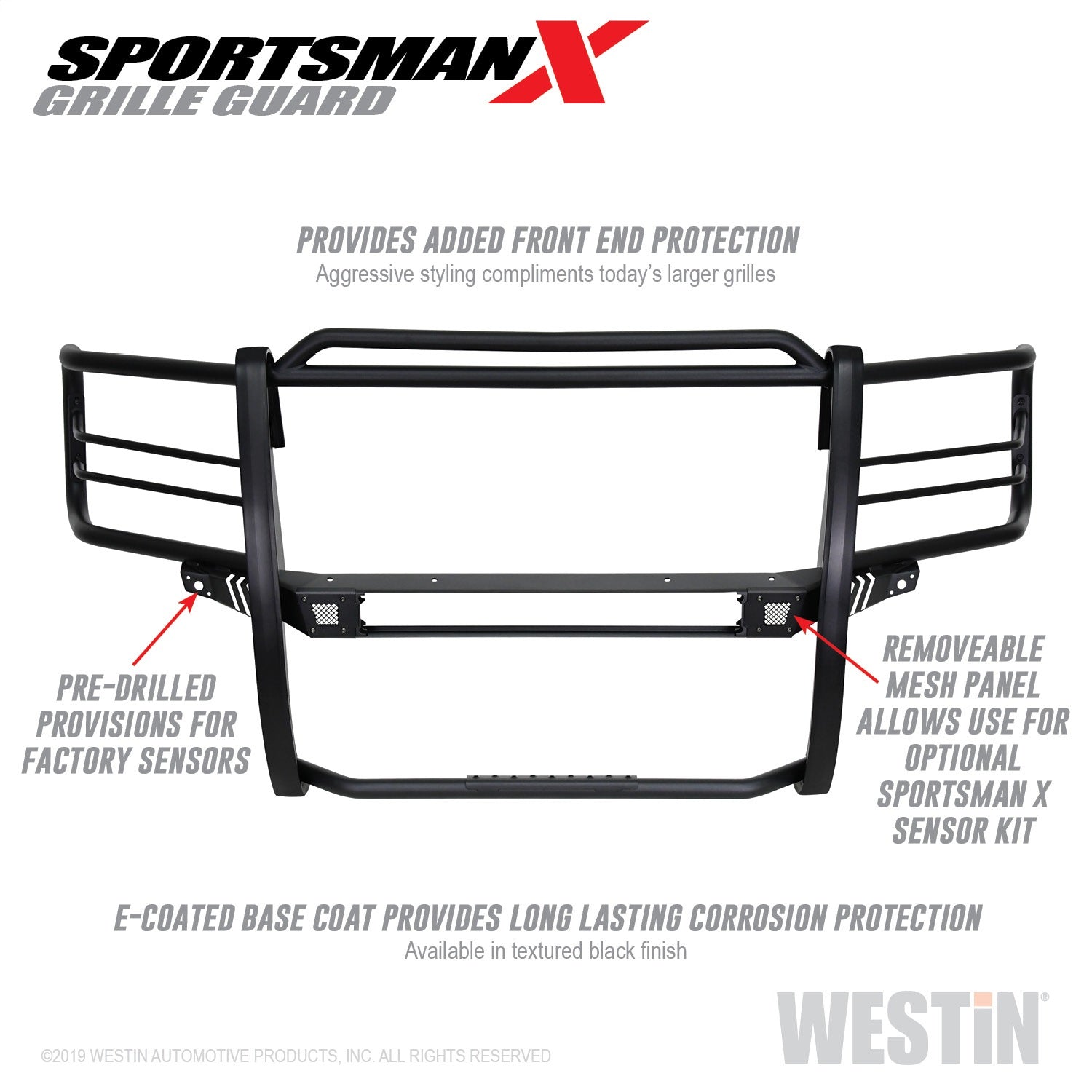 Westins Sportsman X Grille Guard effectively combines aggressive styling with heavy duty front end protection. Engineered to provide both great looks and performance, Sportsman Xs unique design compliments todays larger grille designs, and is available to fit most full and mid size truck applications. Sportsman X has an optional detachable mesh panel (sold separately) which is specifically designed to fit the opening in the center section of Sportsman X Grille Guard, or can be removed to accommodate the flush mounted 26" dual row LED light bar (sold separately). A smaller removable mesh panel designed for the factory sensor location opening is included as standard with Sportsman X. For specific Chevy and Dodge/RAM applications a Sportsman X Sensor Kit (sold separately) is available. An exterior step plate is located on the 1-5/8" bottom tube to provide easy access to the engine compartment. Built with heavy duty 2-1/4" upright rubber strips and 1- 5/8" outer tubes, Sportsman X Grille Guard is designed to provide protection and style for years to come.